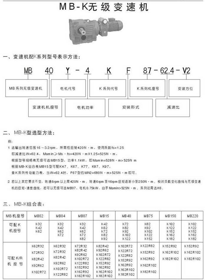 MB-K無(wú)級(jí)變速機(jī)型號(hào)表示法選型方法MB-K組合表